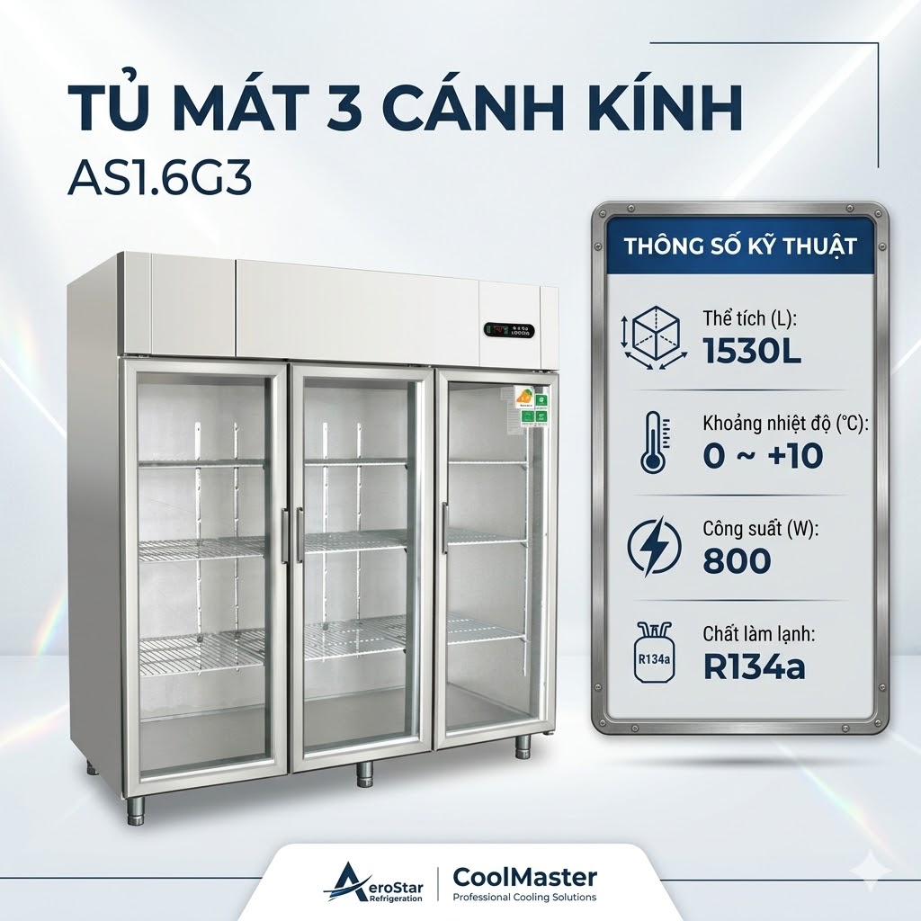 Mô hình AS1.6G3 có kích thước 1837 x 760 x 1965 mm, cung cấp dung tích lên đến 1530 lít, phù hợp cho việc lưu trữ lượng lớn thực phẩm. Nhiệt độ hoạt động từ 0 đến +10°C, với môi trường tối đa 32°C, đảm bảo hiệu suất ổn định ngay cả trong điều kiện khí hậu nóng ẩm.